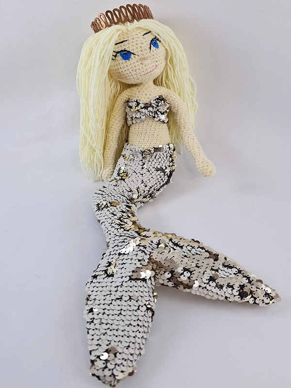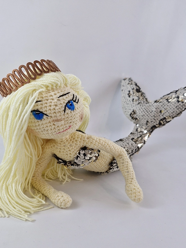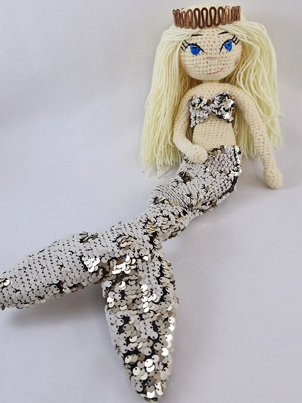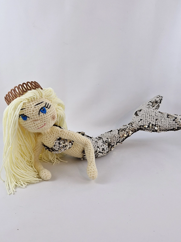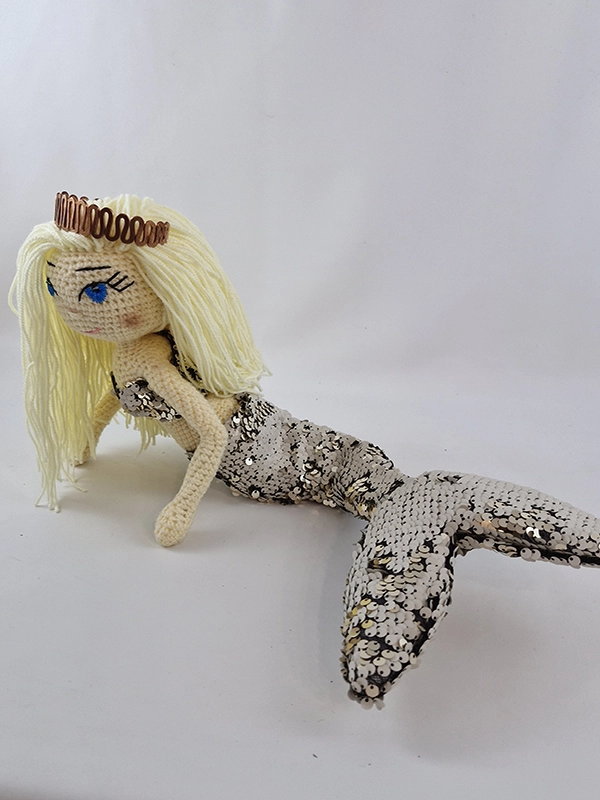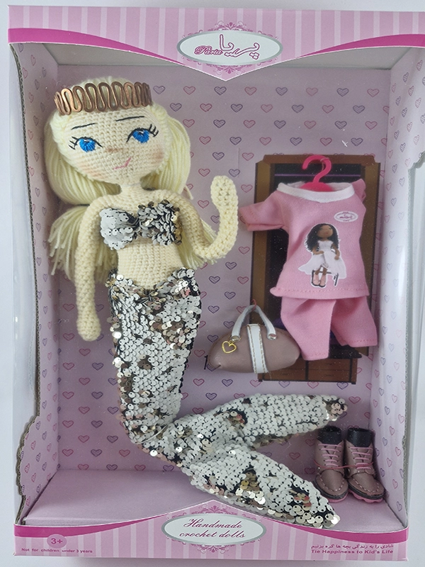 پک عروسک پری دریایی شامل :عروسک ،باله و نیم تنه پولکی رنگ صدفی و نقره ای پری دریایی،