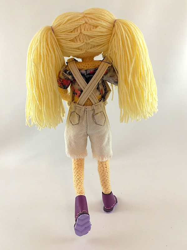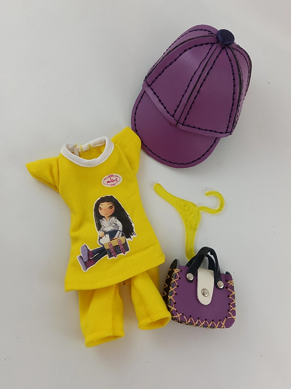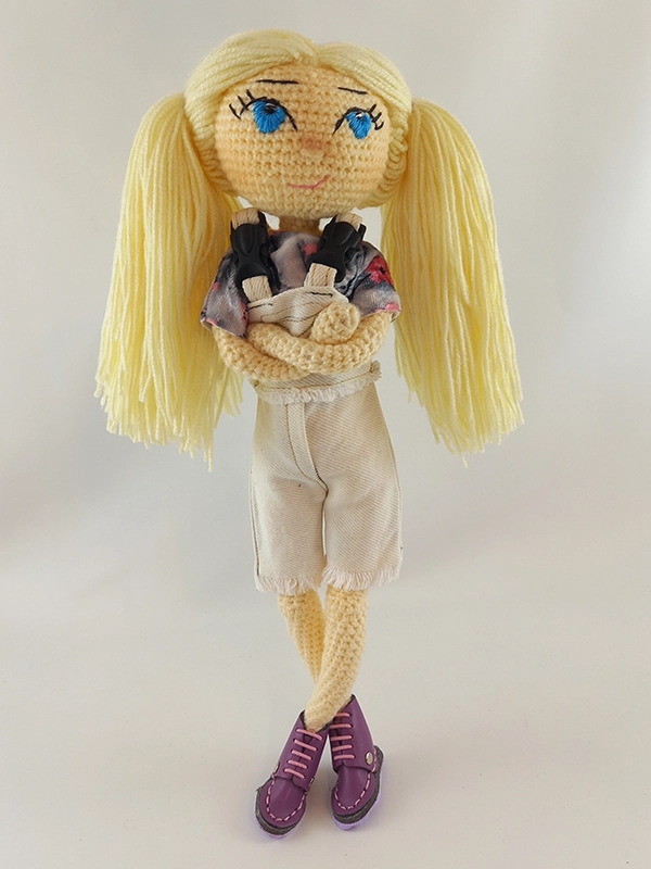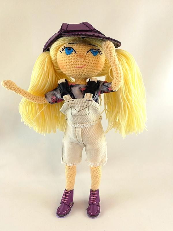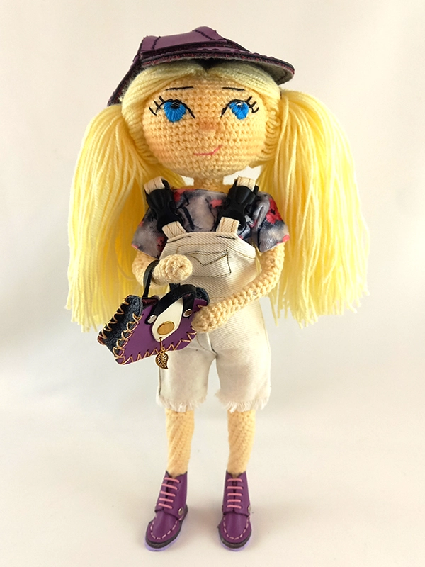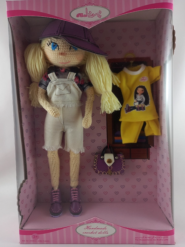 عروسک ،شلوار کوتاه سرهمی رنگ یخی، تیشرت کراپ گلدار ،کلاه و کیف و کفش چرم و یکدست تیشرت و شلوارک