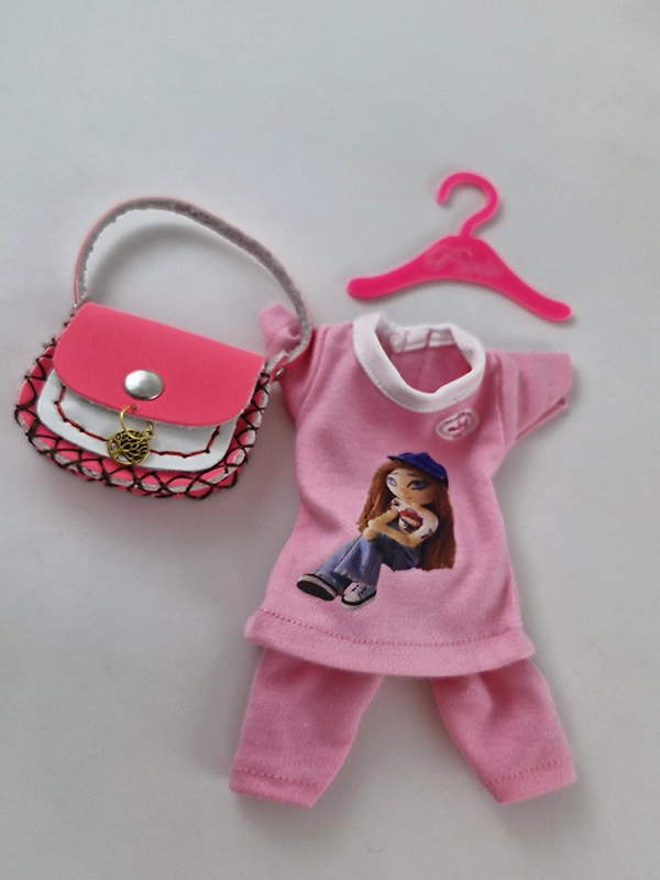 گل سر ست با لباس عروسک، لباس زیر عروسک ،کیف و کفش چرم صورتی و یکدست تیشرت شلوارک است.
