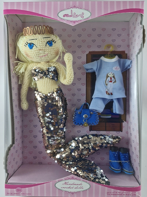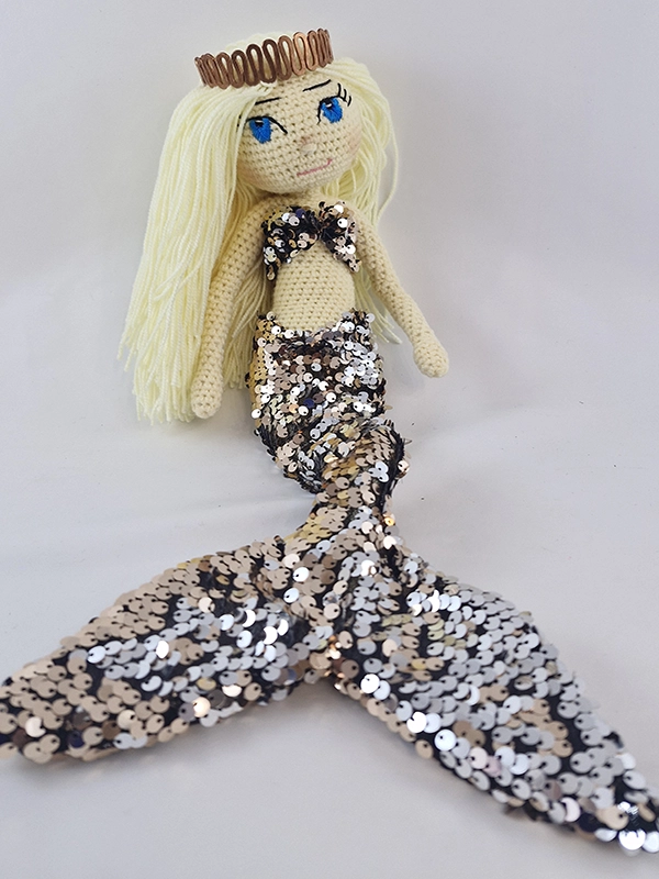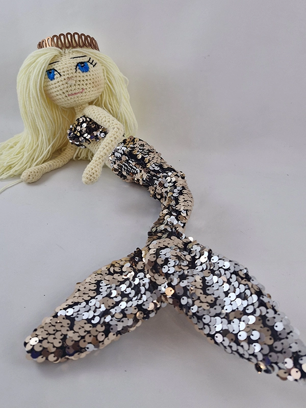 پک عروسک پری دریایی شامل :عروسک ،باله و نیم تنه پولکی رنگ رزگلد و نقره ای پری دریایی،