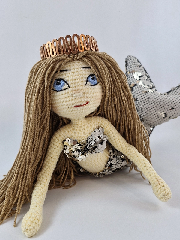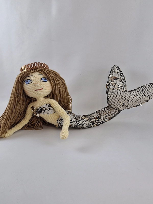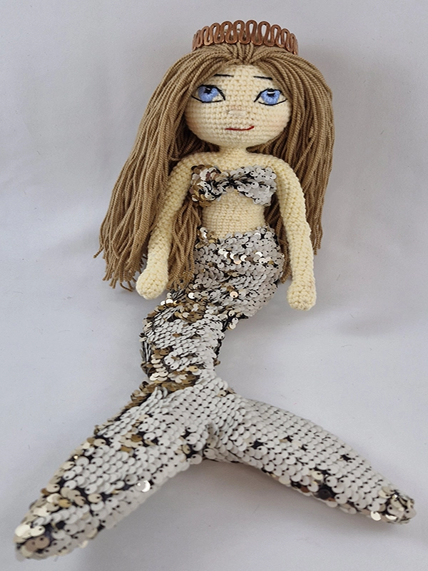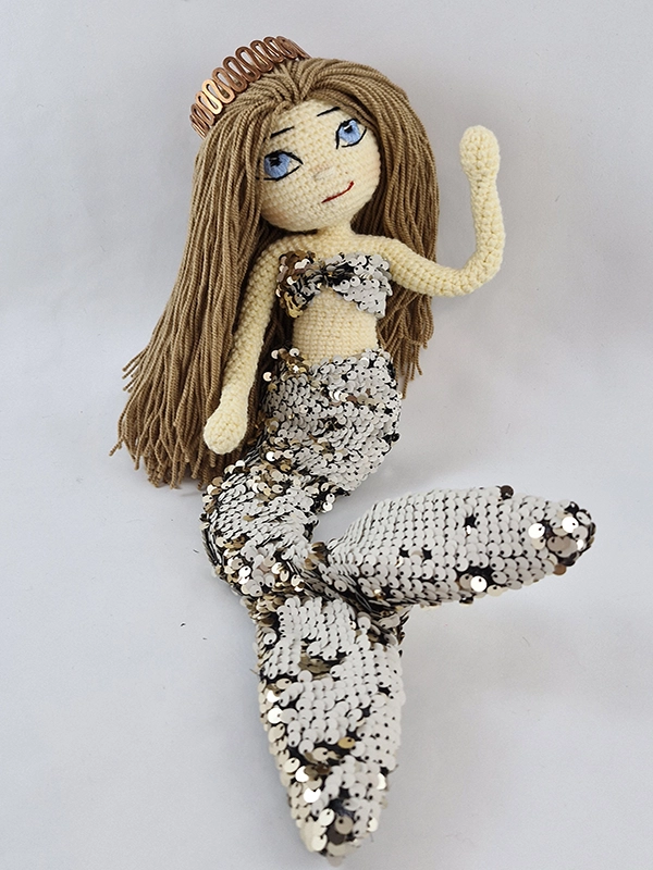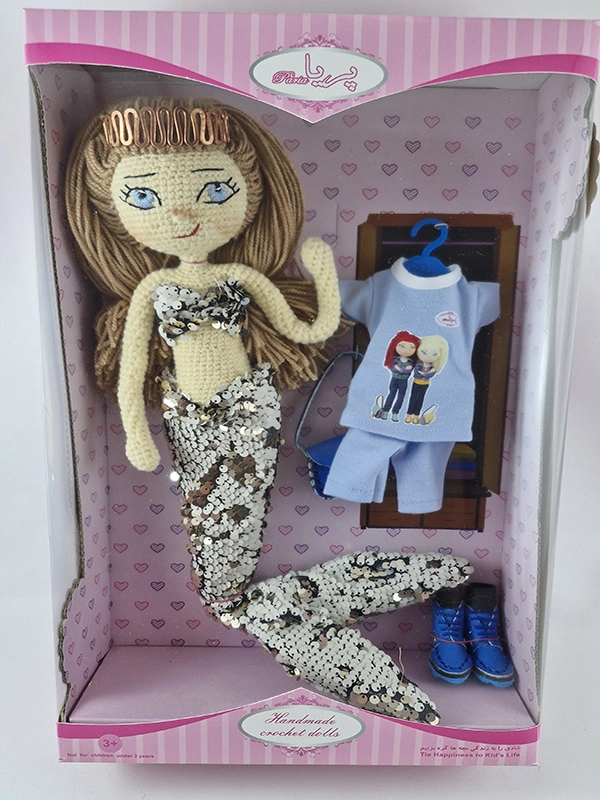 پک عروسک پری دریایی شامل :عروسک ،باله و نیم تنه پولکی رنگ صدفی و نقره ای پری دریایی،