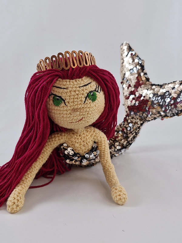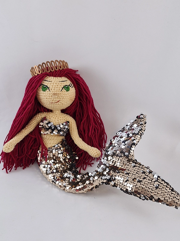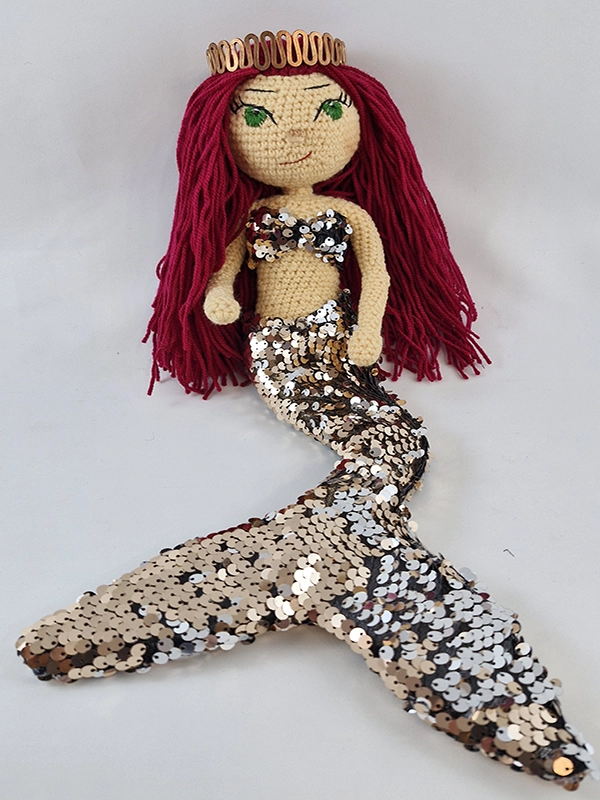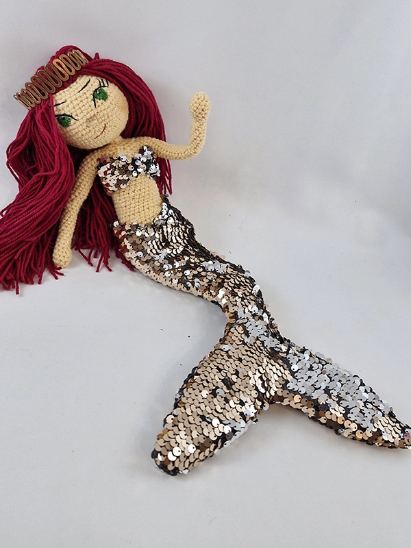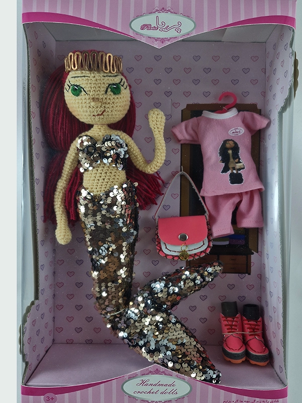 پک عروسک پری دریایی شامل :عروسک ،باله و نیم تنه پولکی رنگ رزگلد و نقره ای پری دریایی،