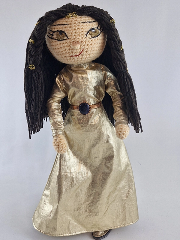 عروسک،پیراهن طلایی آستین بلند ،شنل مخمل آستر دار با یراق طلایی و آستین تشریفاتی باز،