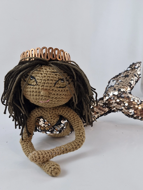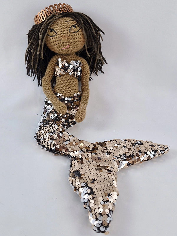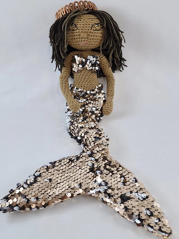 پک عروسک پری دریایی شامل :عروسک ،باله و نیم تنه پولکی رنگ رزگلد و نقره ای پری دریایی،
