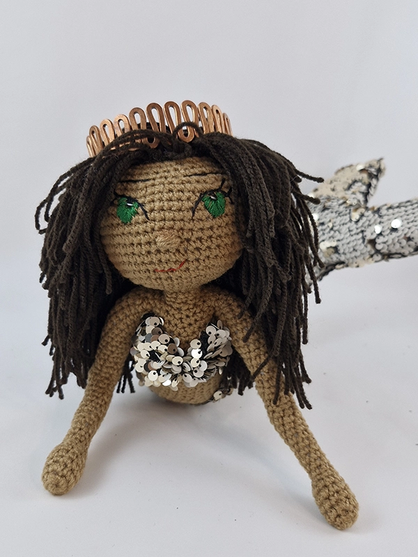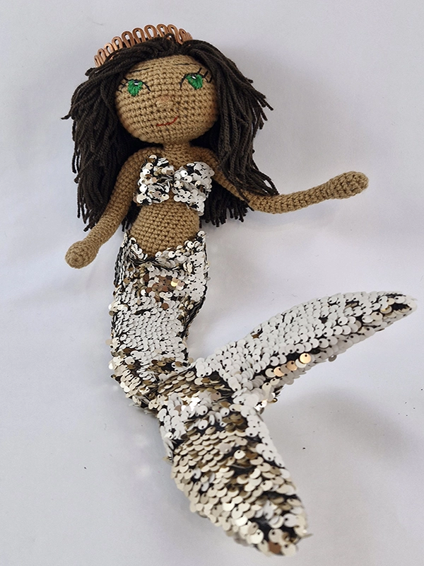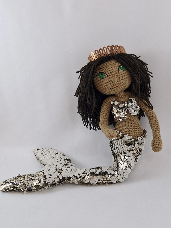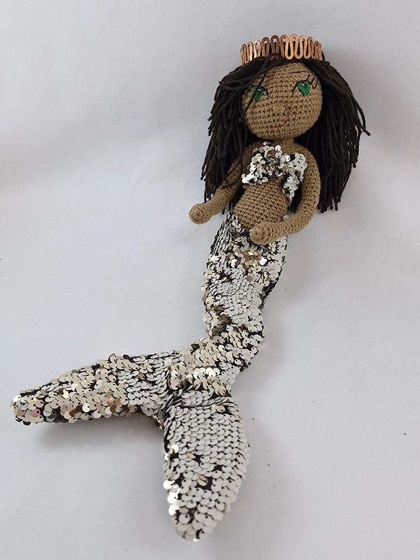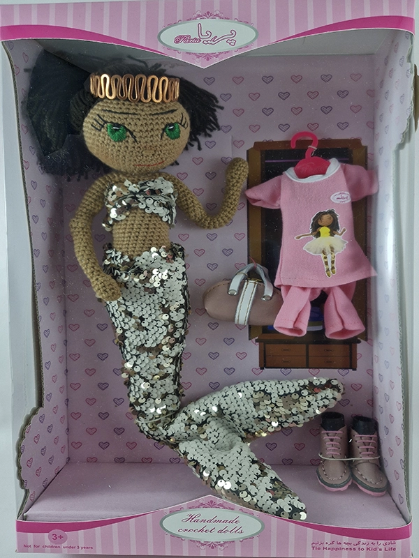 پک عروسک پری دریایی شامل :عروسک ،باله و نیم تنه پولکی رنگ صدفی و نقره ای پری دریایی،