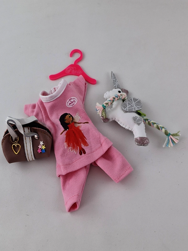 اسب تک شاخ چرمی ،کیف ستاره دار و کفش چرم و یکدست تیشرت شلوارک عروسک می باشد.