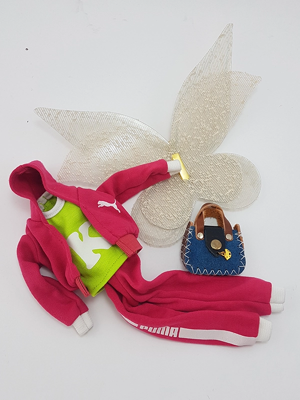 عروسک متصل میشه و از اون جدا میشه،کیف چرم ، کفش چرم و کاپشن و شلوار ورزشی و تاپ میباشد