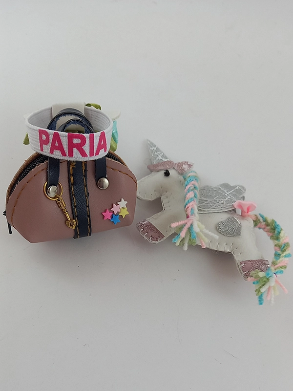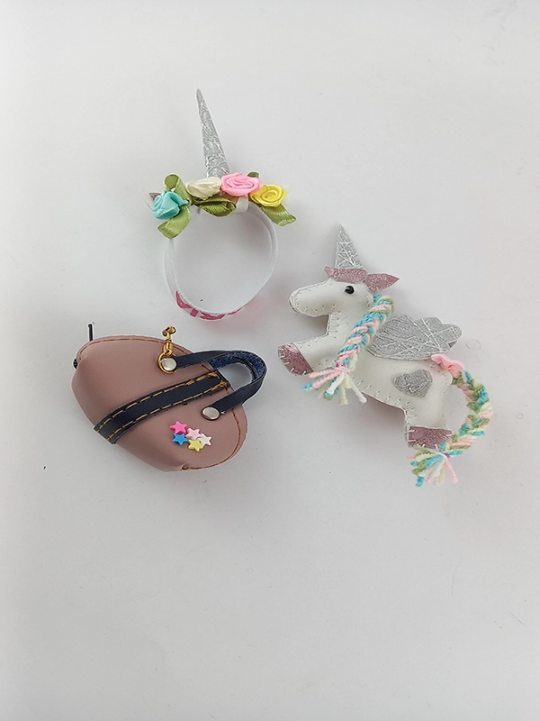اسب تک شاخ چرمی ،کیف ستاره دار و کفش چرم و یکدست تیشرت شلوارک عروسک می باشد.